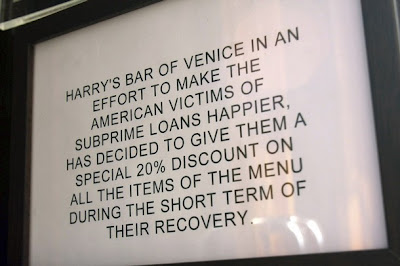 Background: In ultima vreme, patru banci americane au dat faliment... bancile elvetiene nu mai sunt chiar atat de sigure... lumea e intoarsa cu kuru'n sus de criza Suprime, de care cred ca a auzit si mama, si daca nu a auzit, o sa afle de ea cand or sa-i spuna aia de la banca ca din cauza ei tre sa plateasca mai mult la rata lunara... Pentru ca efectele devastatoare ale crizei financiare sa fie cat mai putin resimtite de cei care au luat credite, un bar din Venetia a afisat asta (foto) la intrare. Capitalismului occidental feroce vs Comunismul romanesc post decembrist!